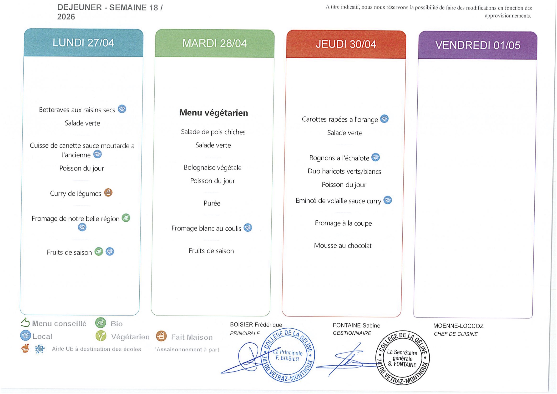MENU SEMAINE 18 DU 27 AU 30 AVRIL 2026